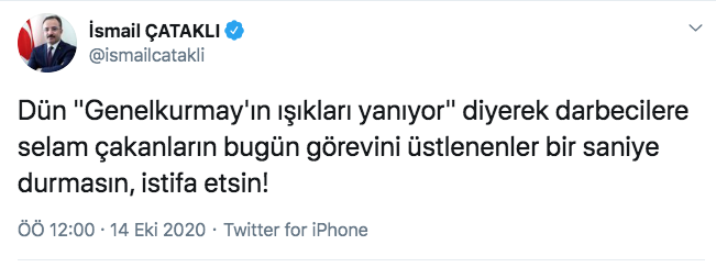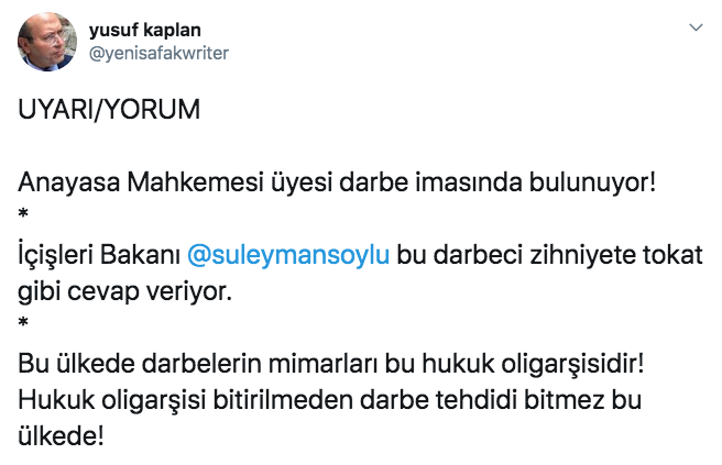 MHP kanadından tepki de Genel Başkan Yardımcısı İstanbul Milletvekili İzzet Ulvi Yönder'den geldi. MHP'li vekil 'akıllı ol' diyerek şunları yazdı: -AYM’nin ışıklar yanıyor mesajı veren üyesine diyorum ki: Yaka yaka ışık mı yaktın? Işığı açık bırakma, israf olur, itiraf olur, laf olur, altından kalkamazsın...Şayet analoji yapıp darbe çağrışımını bu yolla ihsas ve ima ediyorsan millet bunu yemez, hukuk bunu yutmaz. Akıllı ol!