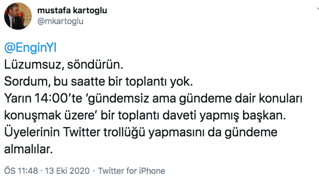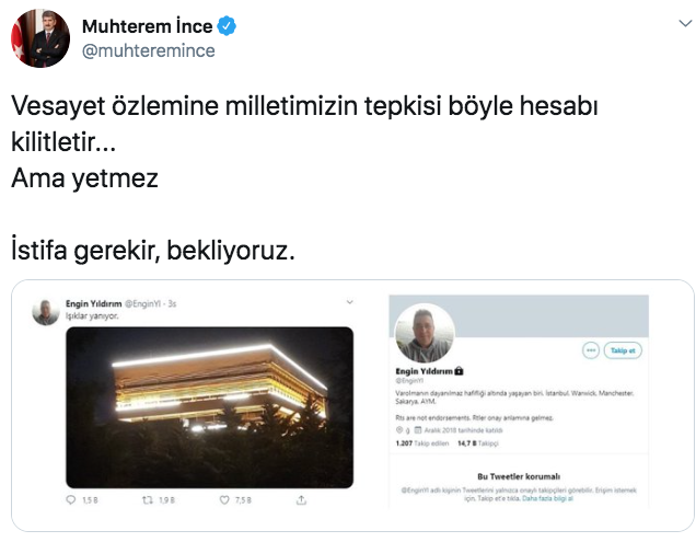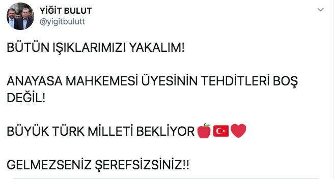 AYM üyesi Engin Yıldırım, ortalık ayağa kalkınca yeni bir mesaj daha attı. Engin Yıldırım bu mesajında 'Işıklar yanıyor derken hukukun ışığını kastettim, başka ışıkları değil" dedi. Yıldırım bu açıklaması ile ortalığı yatıştıramayınca çareyi hesabını koruma altına almakta buldu ve tüm mesajlarını gizledi. Ancak Engin Yıldırım'a tepkiler dinmedi. Hükümet kanadından arka arkaya tepkiler geldi.
