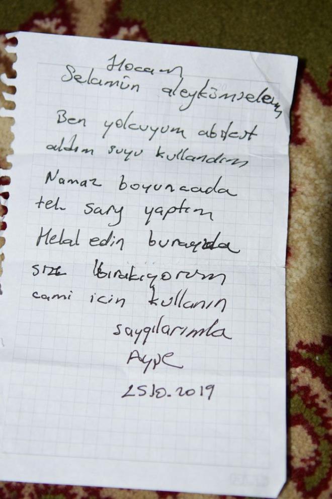 İsminin Ayşe olduğu öğrenilen yolcunun bıraktığı notta ise "Hocam selamün aleyküm. Ben yolcuyum, abdest aldım suyu kulandım, namaz boyunca da telefonu şarj ettim, helal edin. Buraya da size (bir miktar para) bırakıyorum, cami için kulanın. Saygılarımla Ayşe" ifadeleri yer aldı.