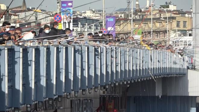İstanbul'da olta balıkçıları Galata Köprüsü ile Unkapanı Köprüsü’ne akın etti, corona virüs önlemleri arasındaki maske takma ve sosyal mesafe kuralı hiçe sayıldı. Yan yana, omuz omuza olta sallayan balıkçıların görüntüsü şaşkınlık yarattı.