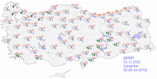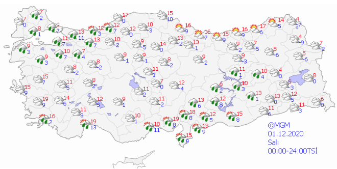 Tahminlere göre bugün yurdun güney ve batı kesimlerinin parçalı yer yer çok bulutlu, Marmara, Doğu Akdeniz, Güneydoğu Anadolu, Muğla, Antalya ve Isparta çevreleri ile İzmir ve Aydın’ın kıyı kesimlerinin yağmur ve sağanak yağışlı, diğer yerlerin az bulutlu ve açık geçeceği tahmin ediliyor.