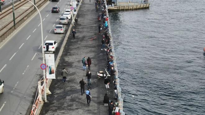 Üsküdar sahilde balık tutan Kamil Güney "Şu anda Üsküdar'dayız, balık tutuyoruz. Mesafelerimiz üç metre. Dün akşam televizyonda dinledik. İçişleri Bakanımız uyardı. Üçer metre mesafeyle tutacağımızı söyledi. Biz de onu uyguluyoruz aramıza kimse sokmuyoruz. Bu mesafede koruyoruz kendimizi." dedi.