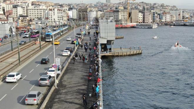 10 yıldır Galata Köprüsü'nde balık tuttuğunu söyleyen Cengiz Çullu, "Mesafelere bakıyorum. Normal standartlarda. Öncekilerde iç içe giriyorlardı devamlı. Ama iyi oldu. Artık 3 metre var. Ben memnunum. Otobüslerde de öyle halk minibüslerde de öyle iç içe. Şu anda mesafeyi korusalar hastalık bitecek. Daha iyi olacak" dedi. -