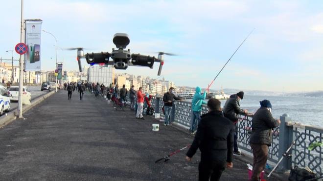 Bugün Galata Köprüsü'nde denetimler başladı. Polis memurları ve zabıta ekiplerinin yaptığı denetimlere anonslu dronelar ve Deniz Zabıtası da eşlik etti. -