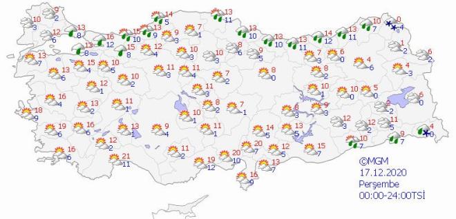 Perşembe, cuma ve cumartesi günleri ülkenin kuzey ve doğu kesimlerinde hava parçalı, yer yer çok bulutlu olacak. Karadeniz kıyıları ve Doğu Anadolu'nun doğusunun yağışlı geçeceği tahmin ediliyor. Yağışların genellikle yağmur ve sağanak, Doğu Karadeniz'in iç kesimleri ile Doğu Anadolu'nun doğusunda karla karışık yağmur ve kar şeklinde olması öngörülüyor.