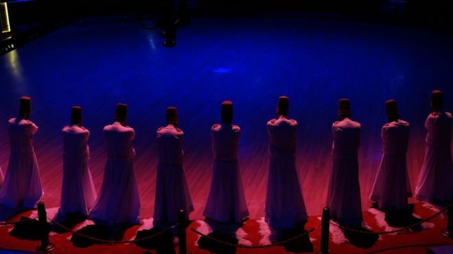 Tasavvuf müziği eşliğinde gerçekleşen sema gösterisinde semazenler, ilk önce kollarını çapraz bağlayarak görünüşte '1' rakamını temsil eder ve böylece Allah'ın birliğini tasdik eder. Ardından kollarını her iki tarafa açıp zikir yaparak sağ eli dua eder gibi yukarıya, sol eli aşağıya açıktır. Bu, "Haktan alır, halka saçarız, hiçbir şeyi kendimize mal etmeyiz, görünüşte var olan, vasıtalık eden bir suretten başka bir şey değiliz" anlamına gelmektedir. Sağdan sola kalbin etrafında dönerek, bütün insanları, bütün yaratılmışları, bütün kalbiyle sevgi ve aşkla kucaklayışıdır. Yedi bölümden oluşan semanın her bölümünün ise ayrı bir manası bulunuyor.