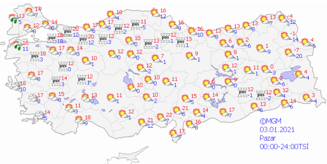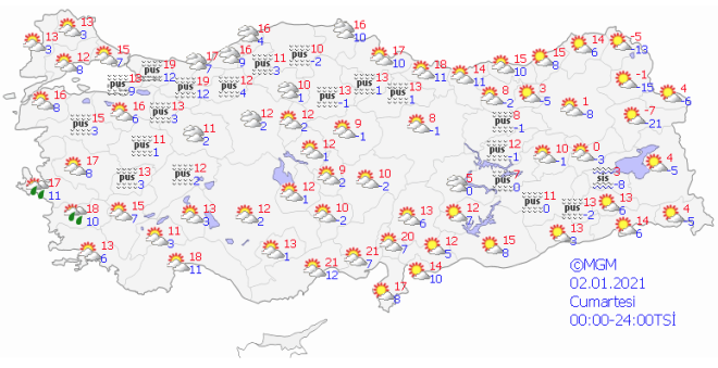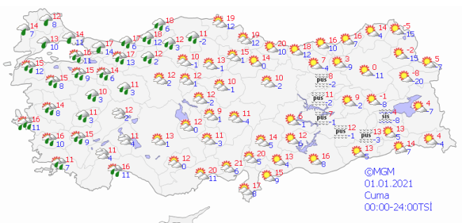 Gece ve sabah saatlerinde yurdun doğusunda buzlanma ve don, kuzey, iç ve doğu bölgelerde ise yer yer pus ve sis tahmin ediliyor.