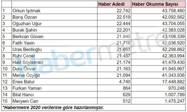Listede Merve Özyiğit 21 bin 163 haberle 11. sırada, Enes Batur 4 bin 740 haberle 12. sırada, Furkan Yaman 864 haberle 13. sırada, Bilal Hancı 629 haberle 14. sırada, Meryem Can 512 haberle 15. sırada yer buldu.