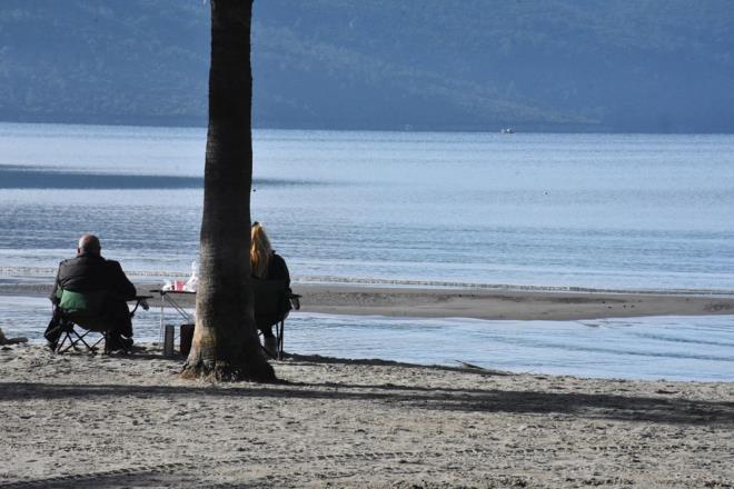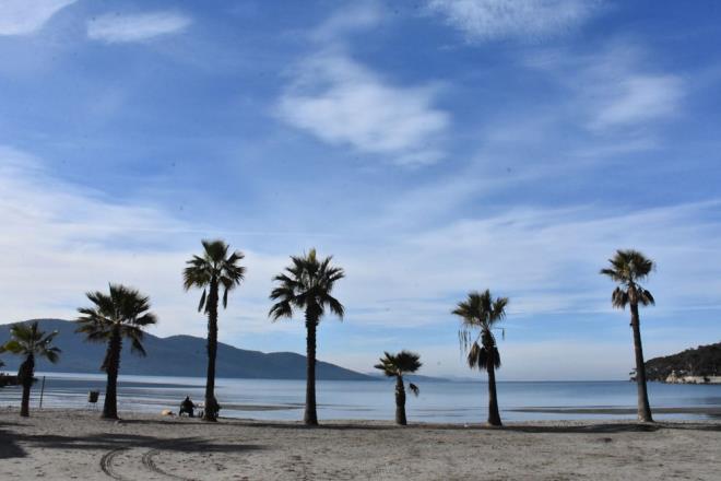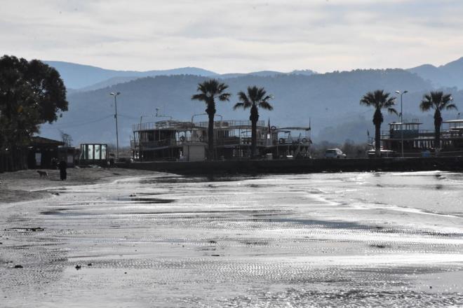 Hava sıcaklığının 12 derece ölçüldüğü Akyaka Mahallesi'nde sahile gidenler suların çekildiği noktalarda yürüyüş yaptı, fotoğraf çektirdi.