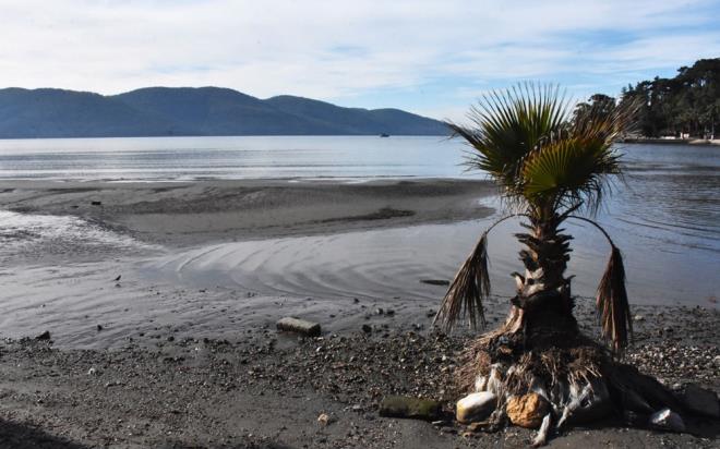 Muğla'nın Ula ilçesindeki Akyaka sahilinde deniz suyu kıyıdan yaklaşık 20 metre çekildi.