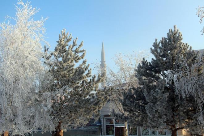 Dükkanların ve araçların camları buzlarla kaplanırken, ağaçlar kırağı tuttu. Güvercinleri ise esnaf yemledi.