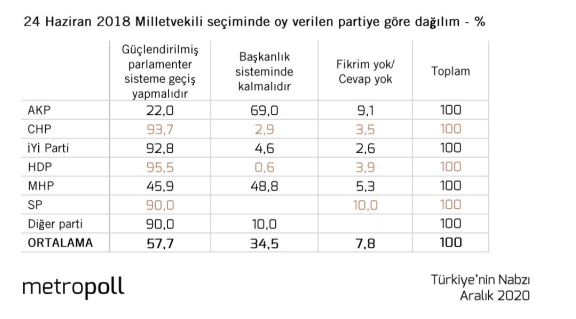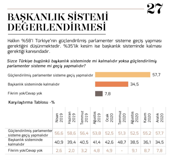 Araştırma sonucu önceki aylarla kıyaslandığında, 'güçlendirilmiş parlamenter sistem'e geçmek isteyenlerin oranında artış olduğu görüldü.