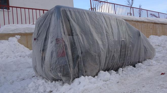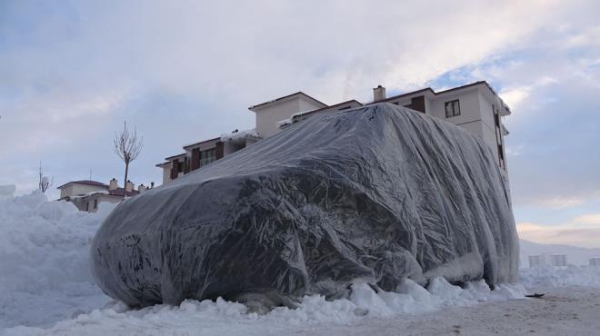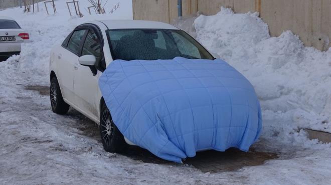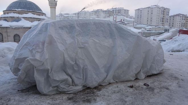 Sürücüler evlerinin önündeki araçların üzerini naylon, battaniye ve brandayla kapatarak soğuktan korumaya çalıştı.