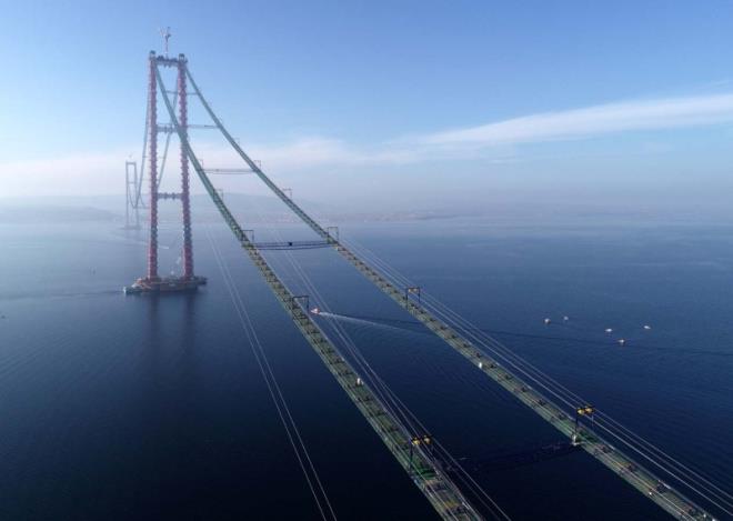 Bakan Karaismailoğlu, köprünün Avrupa ve Asya ankraj bloklarında imalatların yüzde 99 oranında gerçekleştiğini, askı halatı ve tabliye imalatlarının fabrikalarda devam ettiğini bildirdi.