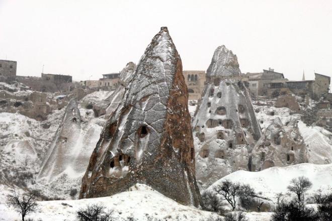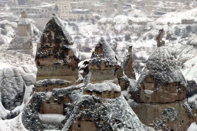 Nevşehir?in merkez ilçeye bağlı Uçhisar ve Göreme beldelerinde bulunan peribacaları kar yağışı ile birlikte tablo gibi görüntüler verdi.