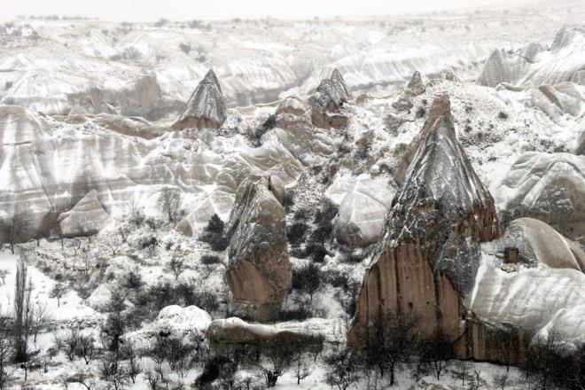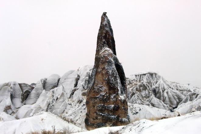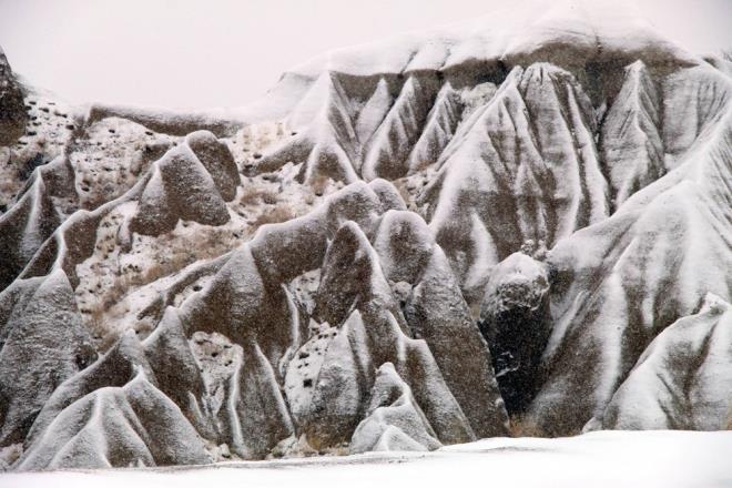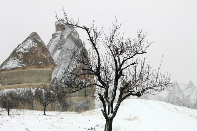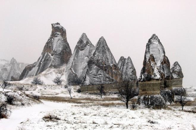 Türkiye'nin önemli turizm merkezlerinden Kapadokya bölgesinde yağan kar yağışıyla birlikte peribacaları tablo gibi fotoğraflar verdi.