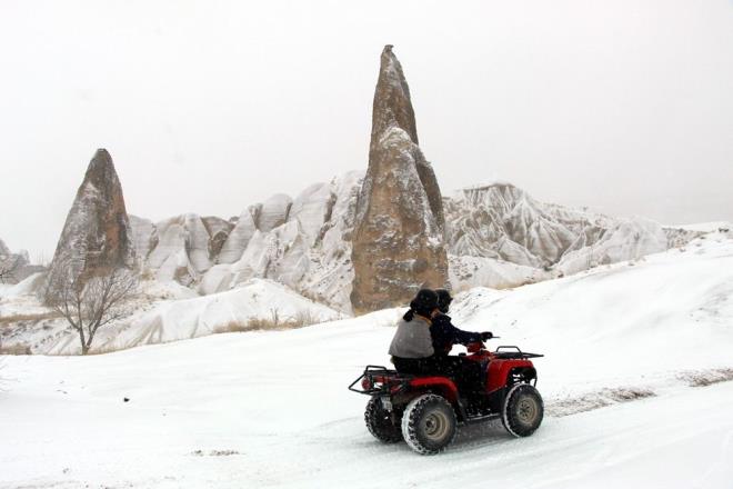 Bölgeyi ziyaret eden turistlerin ise ATV turlarıyla karla kaplı peribacalarının görsel şölenini keşfetmesi dikkatlerden kaçmadı.