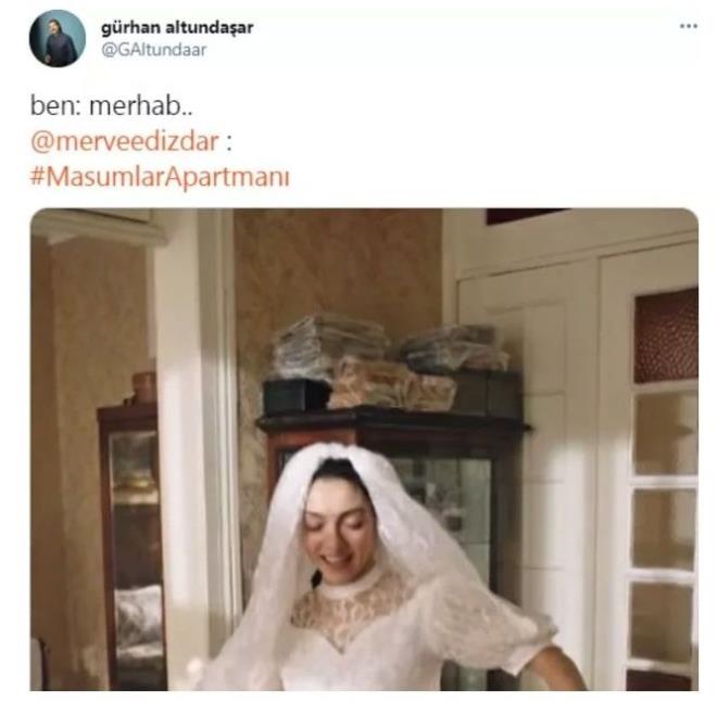 Gürhan Altundaşar sosyal medya hesabından eşinin dizideki gelinlikli bir karesini paylaştı ve "ben: merhab.. @merveedizdar" dedi. Dizdar ise eşine gülerek "Ya sen kocamsın ayıp ya" yanıtını verdi. Çiftin paylaşımlarına çok sayıda beğeni ve yorum yapıldı.