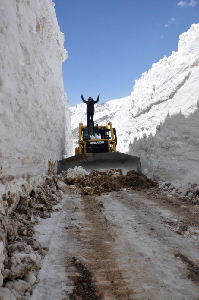 Kepçenin boyunu aşan karda ilerlemekte güçlük çeken ekipler, çığ tehlikesine rağmen çalışmalarına gece gündüz devam ediyor.