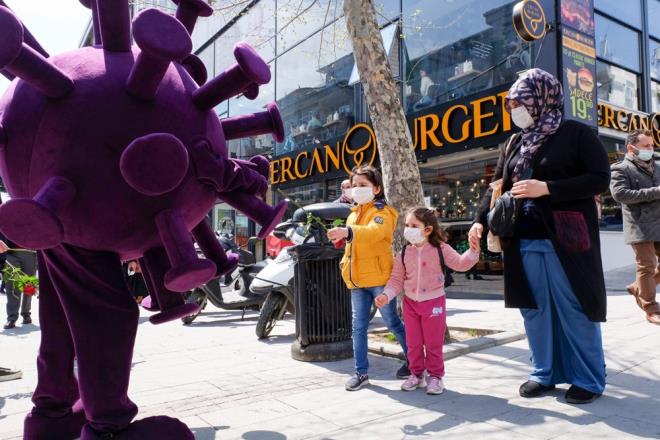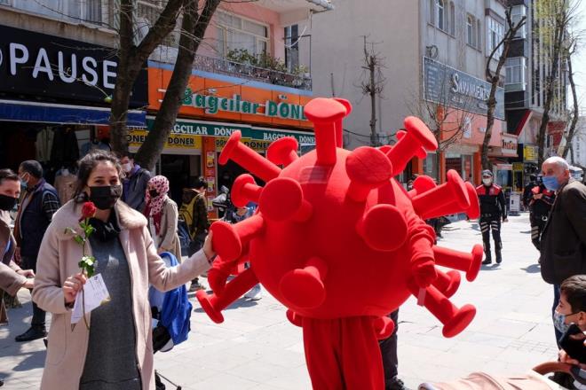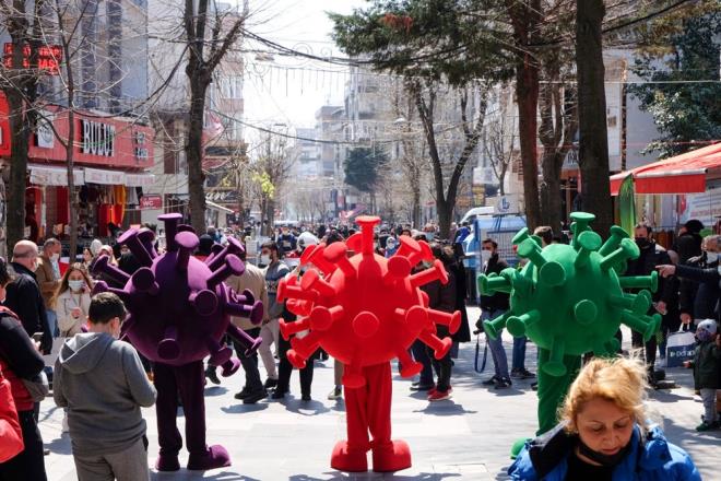 Bağcılar'da belediye tarafından corona virüs etkinliği düzenlendi. Corona virüs kostümlü animatörler vatandaşların ilgisini çekti.