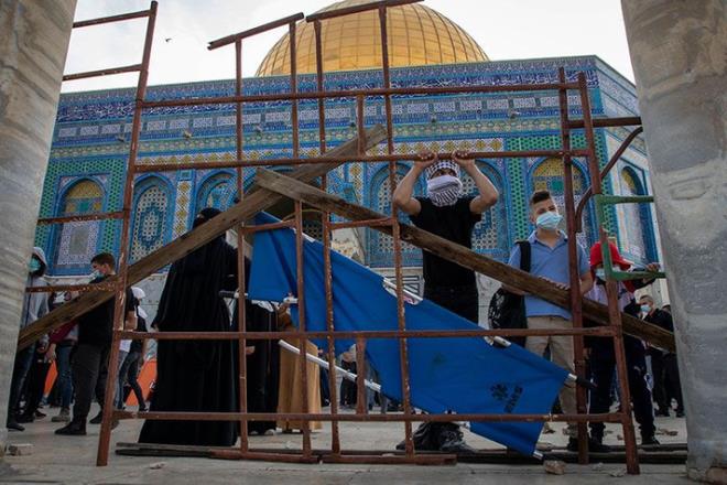 Filistinliler, buldukları tahta ve benzeri şeylerle Harem-i Şerif'in bazı noktalarına barikatlar kurdu. Harem-i Şerif'ten ayrılmayacaklarını dile getiren Filistinliler, sık sık "Canımız kanımız sana feda Aksa" sloganı attı.