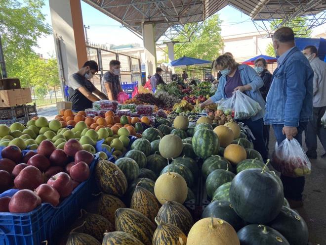 Salgın tedbirleri kapsamında kurulan pazara gelen vatandaşlar, Covid-19 tedbirlerinde uyarak taze sebze ve meyvelerden satın alıyor.