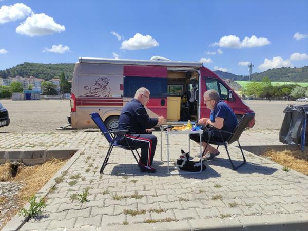 Burada sıkı dostluklar kuran karavancılar, araçlarının önüne kurdukları masalarda dostlarıyla denize karşı tavla oynayıp keyifli vakit geçiriyor.