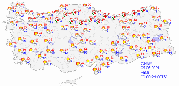 İç Anadolu: Parçalı ve çok bulutlu, sabah ve öğle saatlerinde Karaman dışında bölge genelinin aralıklı sağanak ve gök gürültülü sağanak yağışlı geçeceği tahmin ediliyor. Rüzgarın; öğle saatlerinde bölgenin doğusunda batı yönlerden kuvvetli olarak (40-60 km/sa) esmesi bekleniyor.