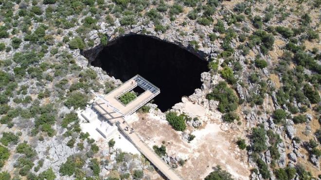 "CEHENNEMİ İZLEMEK" ARTIK DAHA KOLAY Ürkütücü atmosferiyle öne çıkan, içbükey kenarları nedeniyle inilmesi mümkün olmayan 128 metre derinlikteki Cehennem obruğuna da cam seyir terası yapıldı.