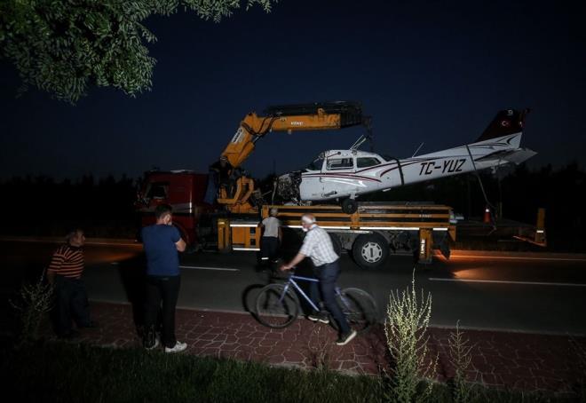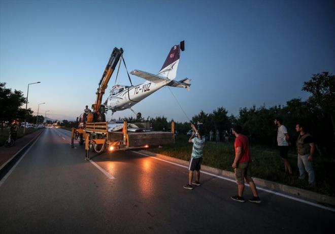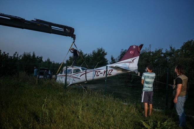 Cessna tipi 2 kişilik uçak, dün öğle saatlerinde henüz bilinmeyen nedenle arıza nedeniyle çevredeki bir meyve bahçesine acil iniş gerçekleştirmişti.
