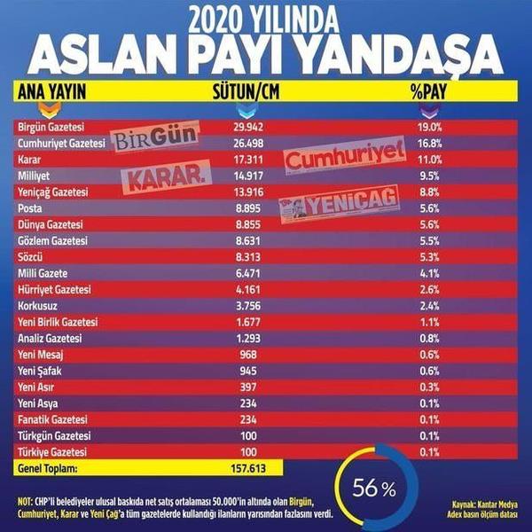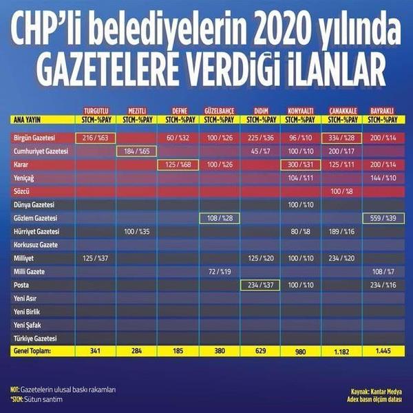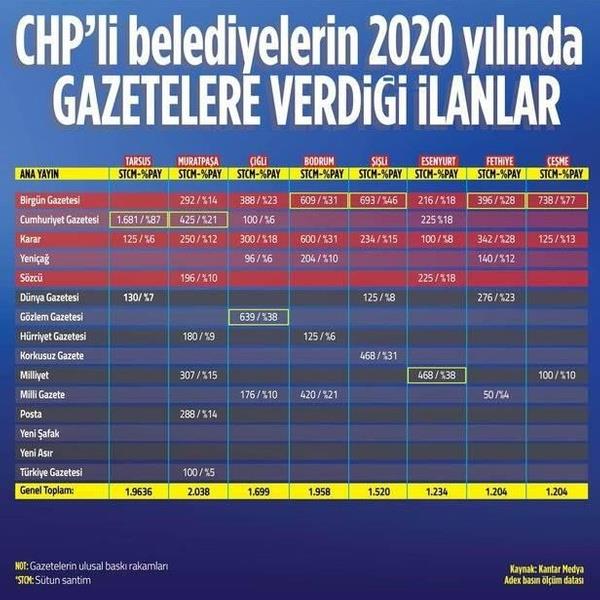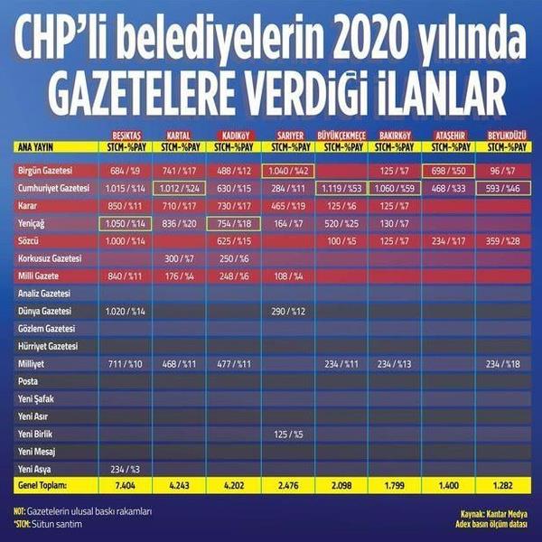 Yazılı basın 2020 yılı reklam kullanım verilerine göre; Cumhuriyet Halk Partili (CHP) belediyeler 2020 yılında ulusal baskıda net satış ortalaması 50 binin altında olan Birgün, Cumhuriyet, Yeniçağ, Karar gibi CHP ve ittifakının yandaşı gazetelere tüm gazetelerde kullanılan ilanların yüzde 56'sını verdi. Gazetelerde yayınlanan CHP'li belediyelerin reklamlarına ilişkin veriler tüm CHP kaynaklarının tek bir merkezden dağıtıldığını ortaya koydu.