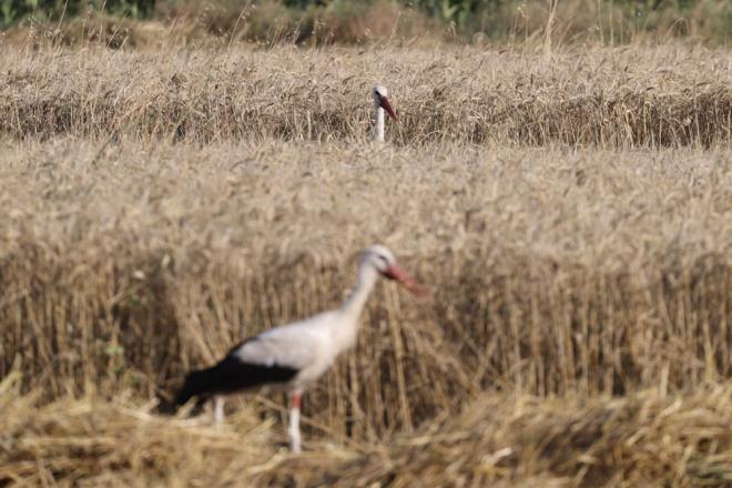 Göçmen kuşlar, bölgede buğday hasadı devam eden tarlalara misafir oluyor.