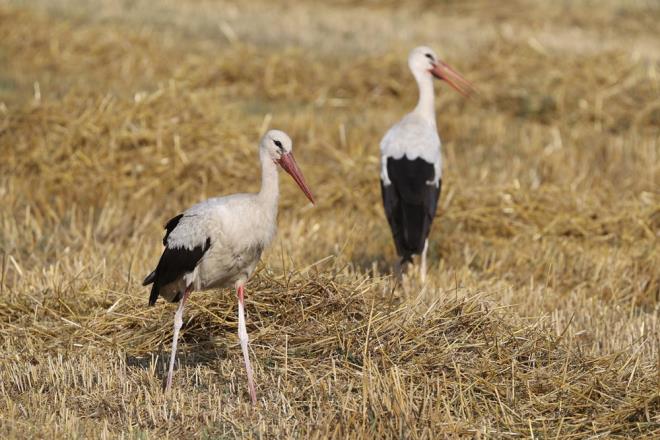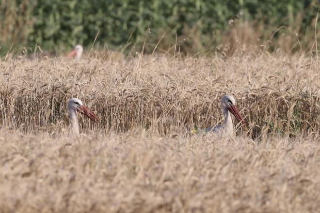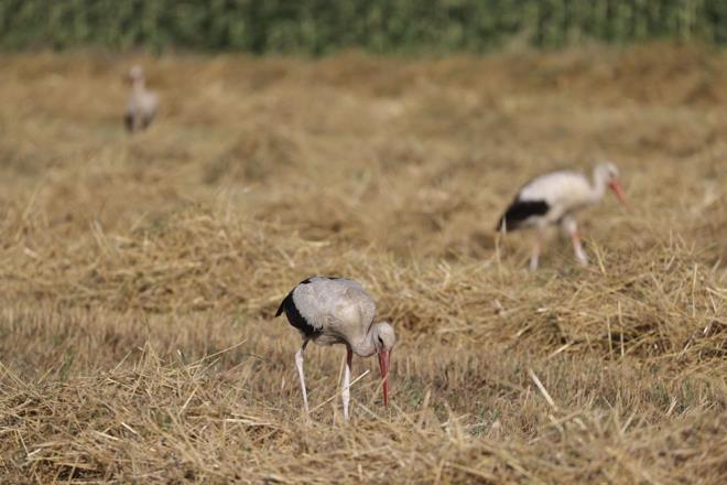 Elektrik ve telefon direklerindeki yuvalarında yumurtadan çıkan yavrularını bırakarak hasat edilen tarlalarda yiyecek arayan leylekler, buğday danesi, çekirge ve böceklerle besleniyor.