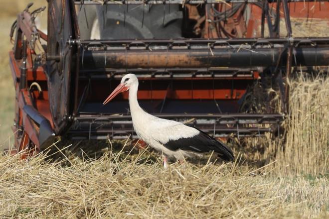 Edirne'ye mart ayında göç eden leylekler, buğday hasadının sürdüğü tarlalarda beslenmeye çalışıyor.