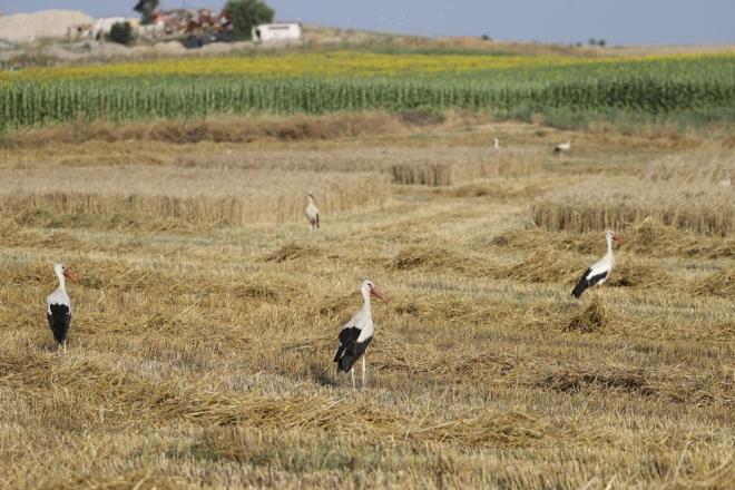 Tarlasında yaklaşık 30 leylek olan çiftçi Mehmet Bilgiç, hasat sırasında bölgedeki leyleklerin buğday tarlalarına toplandığını söyledi.