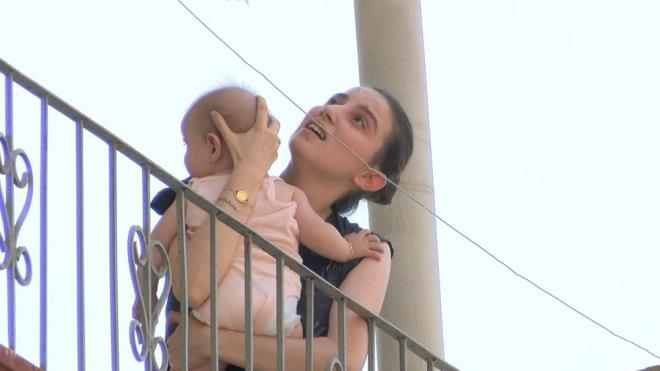 Bir kadının çocuğunu kucağına alarak korku içinde balkonda beklediği görüldü.