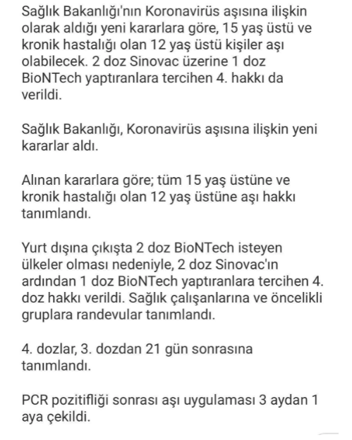 Sağlık Bakanlığı, corona virüsü aşılaması ile ilgili takviminde güncelleme yaptı. Buna göre tüm 15 yaş üstüne ve kronik hastalığı olan 12 yaş üstüne aşı hakkı tanımlandı. PCR pozitifliği sonrası aşı uygulaması 3 aydan 1 aya çekildi. 4. dozlar 3. dozdan 21 gün sonrasına tanımlandı.