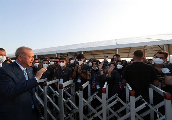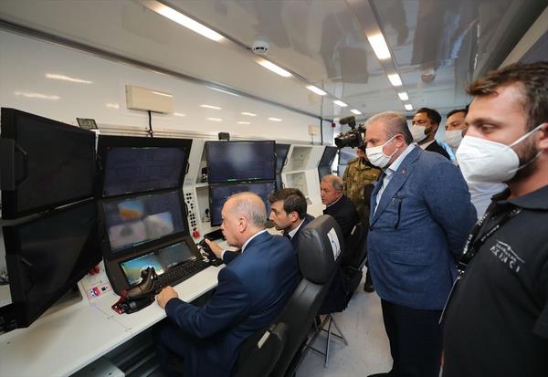 Erdoğan, Bayraktar AKINCI TİHA'nın taksi, kalkış ve alçak uçuşunu izledikten sonra hava araçlarının kontrol merkezine girerek incelemelerde bulundu.