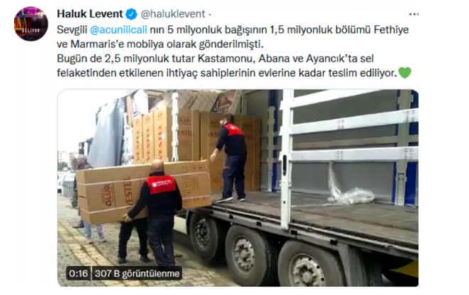 Sosyal medyada paylaşım yapan Levent, "Sevgili Acun Ilıcalı?nın 5 milyonluk bağışının 1,5 milyonluk bölümü Fethiye ve Marmaris'e mobilya olarak gönderilmişti. Bugün de 2,5 milyonluk tutar Kastamonu, Abana ve Ayancık'ta sel felaketinden etkilenen ihtiyaç sahiplerinin evlerine kadar teslim ediliyor" dedi.