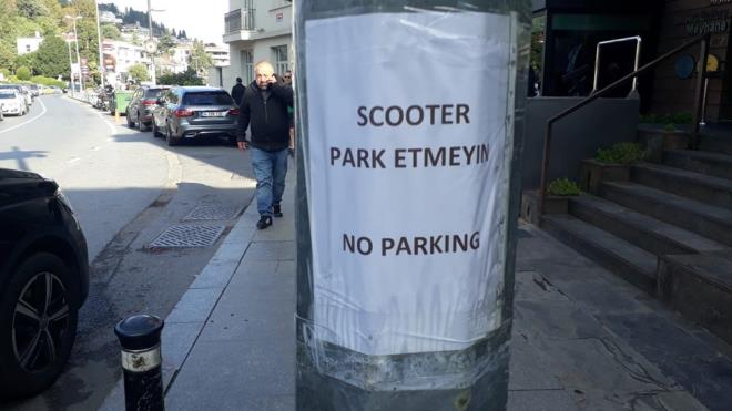 Bazı esnaf ise direklere astıkları "Buraya scooter park etmek yasaktır" yazıları ile duruma çözüm üretmeye çalışıyor.