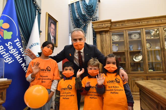Tarihi belediye binası ve Tophane?deki tarihi saat kulesi turuncu renkte ışıklandırılırken, Büyükşehir Belediye Başkanı Alinur Aktaş da hastalığı yenen minik kahramanları makamında ağırladı.