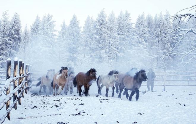 Bölgede yerli bir at ırkı olan Yakut atlarının aşırı soğuklardan dolayı üzerinde beyaz bir tabaka oluştuğu görüldü.