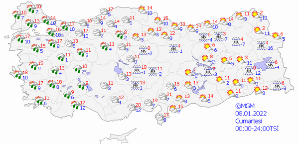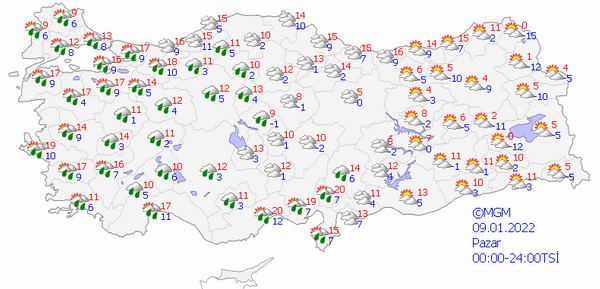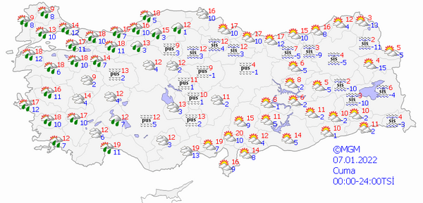 Meteoroloji Genel Müdürlüğü tarafından yapılan son değerlendirmelere göre: Ülkemiz genelinin parçalı ve çok bulutlu, Kıyı Ege, Antalya'nın doğu ve batı ilçeleri, Isparta'nın güney kesimleri ile Osmaniye, Hatay ve Gaziantep çevrelerinin yağmur ve sağanak yağışlı geçeceği tahmin ediliyor. Sabah ve gece saatlerinde iç ve doğu kesimlerde buzlanma ve don olayı ile birlikte pus ve yer yer sis bekleniyor.