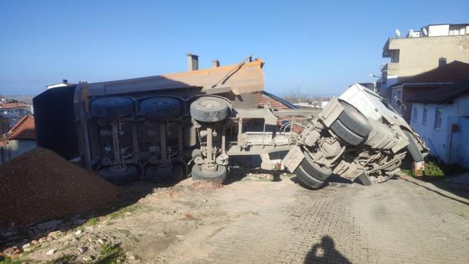 Bursa'nın Mustafakemalpaşa ilçesinde boş arsaya çakıl boşaltan hafriyat kamyonunun damperi, yan taraftaki evin üzerine devrildi. Olayda ölen veya yaralanan olmazken, evin çatısı hasar gördü.