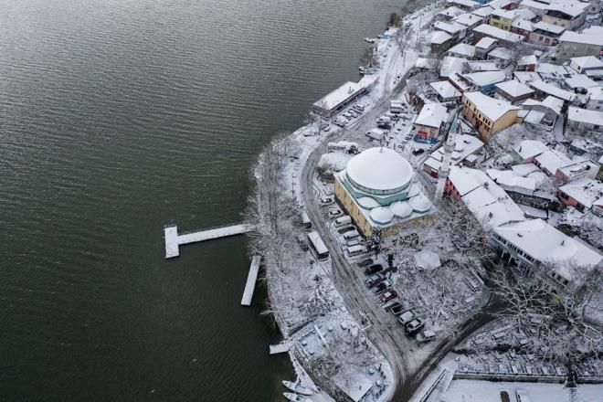 Avrupa'nın en güzel kasabaları arasında gösterilen Bursa'nın Nilüfer ilçesindeki Gölyazı kar yağışı sonrası eşsiz güzelliğiyle büyülüyor. Mahalleye gelen ziyaretçiler, gölde balıkçı ve saltanat kayıklarıyla gezinti yapabiliyor.