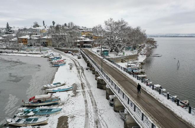 Avrupa'nın en güzel kasabaları arasında gösterilen ve "Küçük Venedik" olarak nitelendirilen Uluabat Gölü kıyısındaki Gölyazı Mahallesi, kar yağışıyla büründüğü farklı güzellikleriyle ziyaretçilerini ağırlıyor.