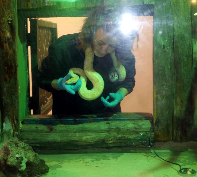 Hafta içi her gün 08.00'de işe başlayan ve 17.00'ye kadar çalışmalarını sürdüren Engür, aralarında boa ve piton da bulunan 17 yılana bakıyor.