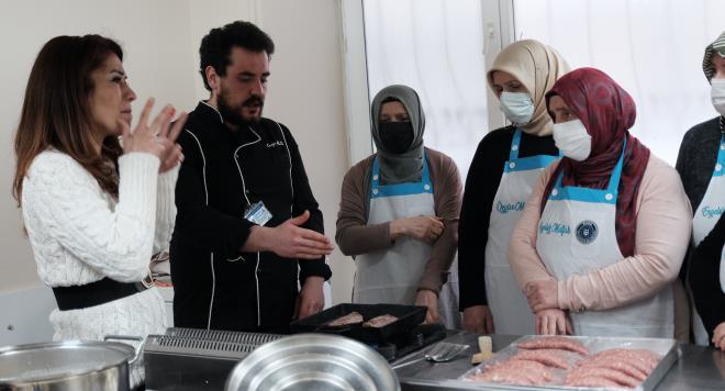 Bursa Büyükşehir Belediyesi'nin halk üniversitesi olan BUSMEK bünyesinde açılan pasta-yemek yapım kursuna katılan işitme engelli kadınlar, işaret diliyle eğitim alarak mutfaktaki hünerlerini sergiledi.