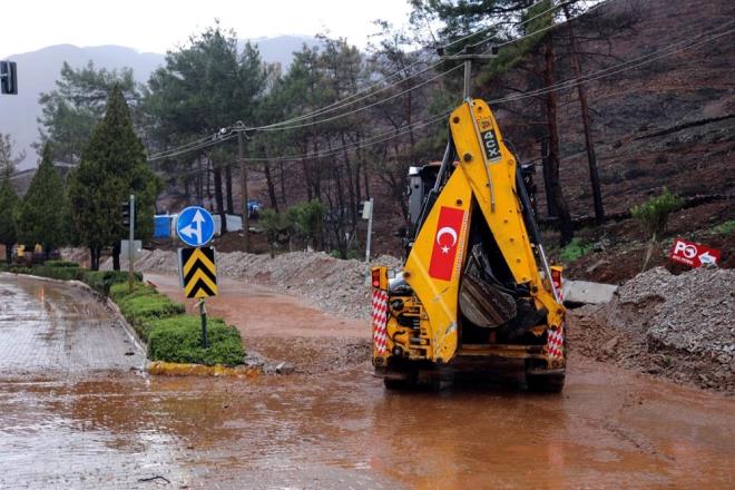 Dağların yanan alanlarından çamurlu sularla taşınan taş ve kaya parçaları ile ağaç dalları temizlendi. Çamurla kaplanan 5 sokak ve 2 cadde de iş makineleriyle temizlendi.