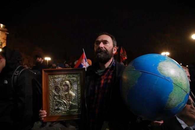 Rusya Devlet Başkanı Vladimir Putin'in, dünyanın "en cesur ve güçlü" devlet adamı olduğuna dair sloganların atıldığı gösteride, Sırbistan Cumhurbaşkanı Aleksandar Vucic aleyhinde "Vatan haini, Sırbistan?ı sattın" ifadesine de yer verildi.